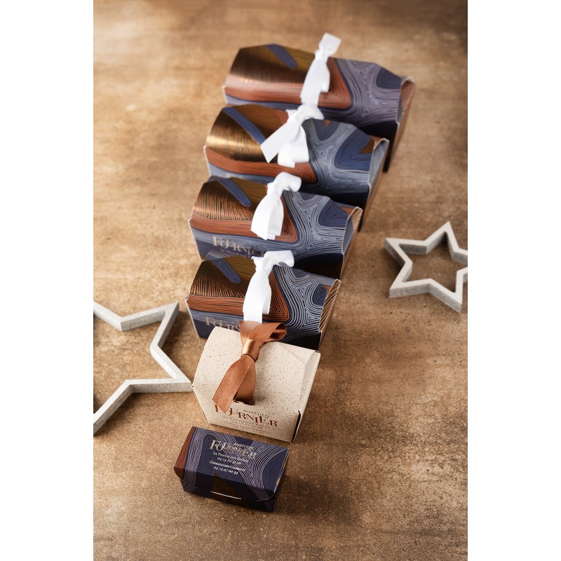 • À l'intérieur, découvrez un assortiment de notre gamme de bonbons de chocolat, Assortiment de ganache, pâte d’amande, praliné Gianduja...