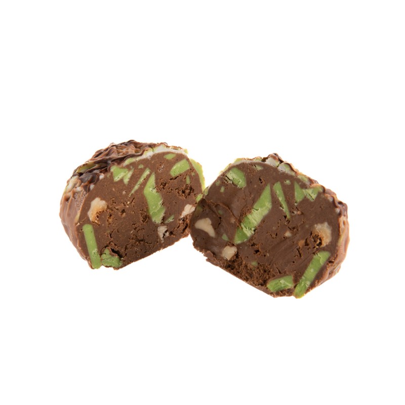 Praliné croustillant avec brisures de noisettes et éclats de chocolat blanc.